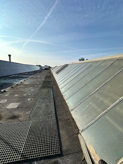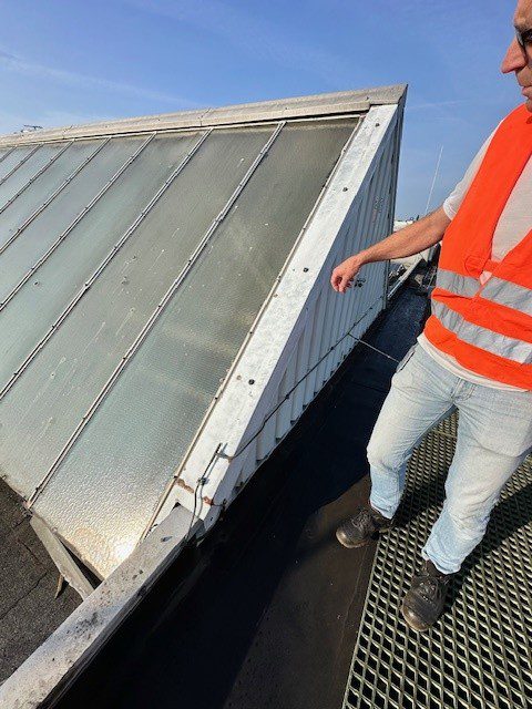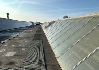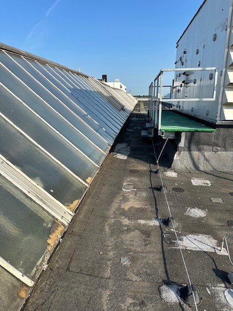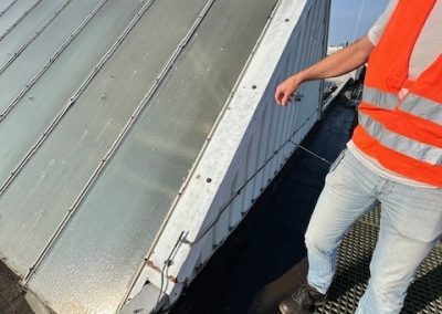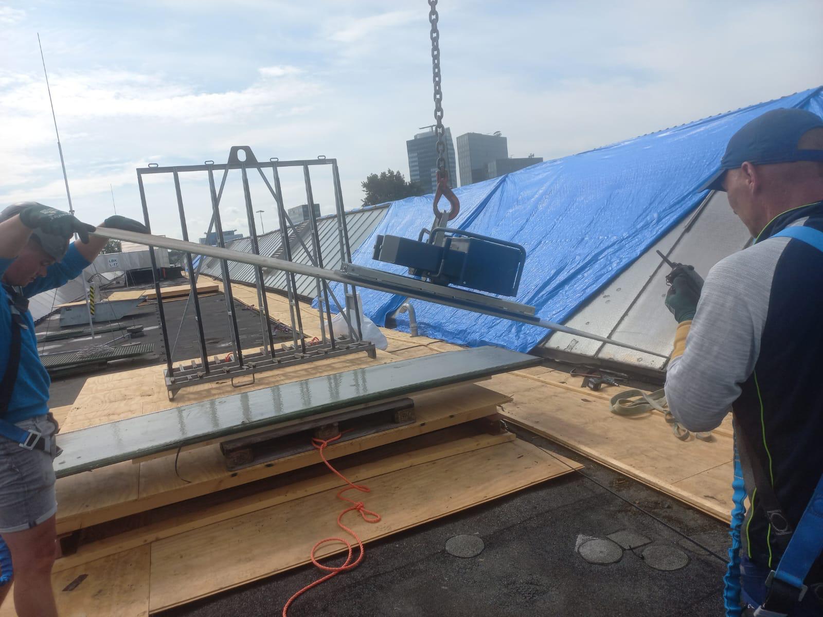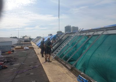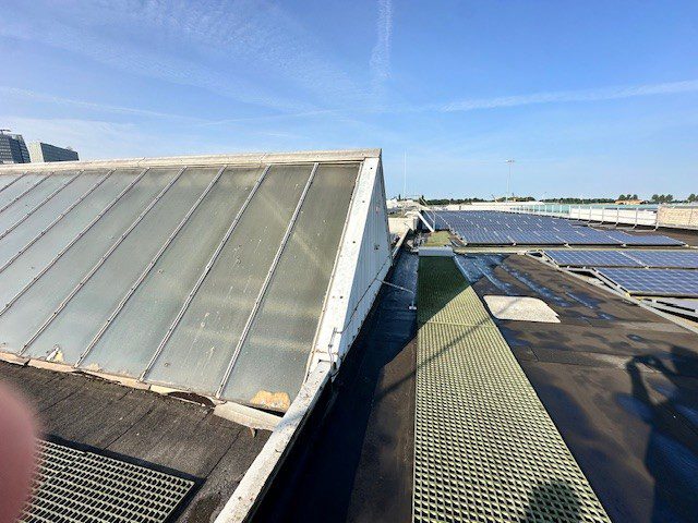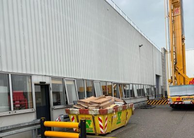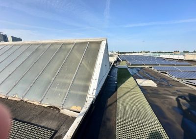 In opdracht van bouwkundig aannemer VDR verwijderden we asbesthoudende sandwichpanelen aan beide zijden van de lichtstraat op het dak van Scania in Zwolle. Ook demonteerden we de glas- en staalconstructie van de lichtstraat voor vervanging.