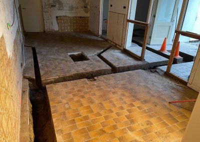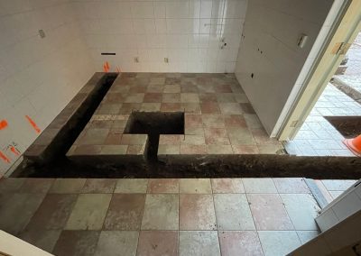 De bestaande vloer is verwijderd en geschikt gemaakt voor het nieuwe leidingwerk. Na afronding van onze werkzaamheden kon de nieuwe vloer worden aangebracht en was de ruimte klaar voor de verdere inrichting van de grootkeuken.