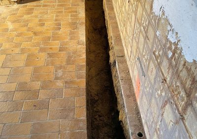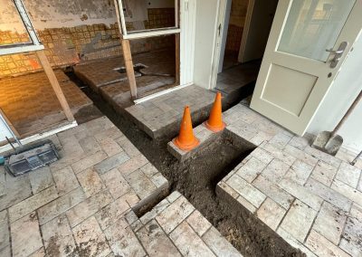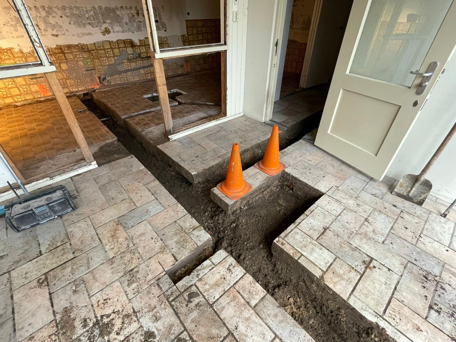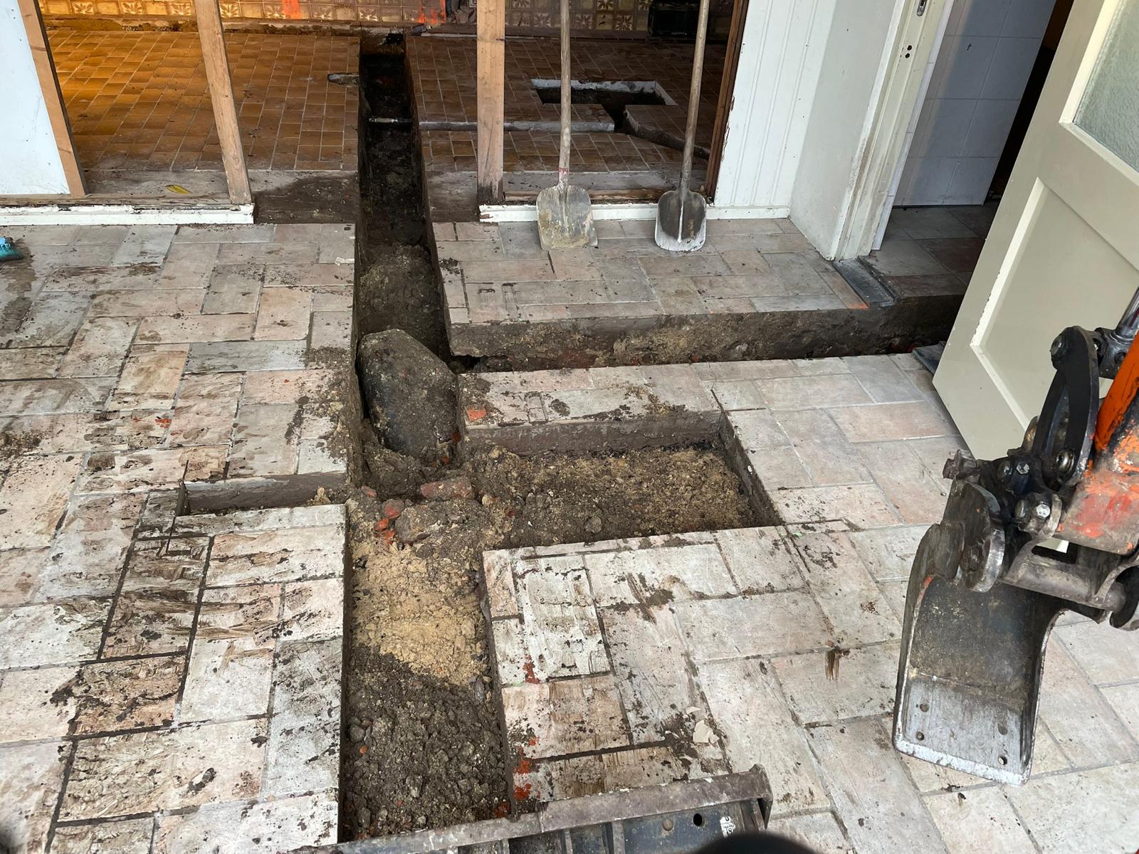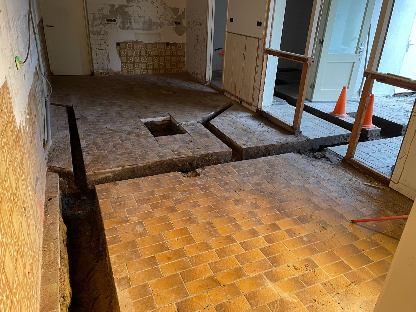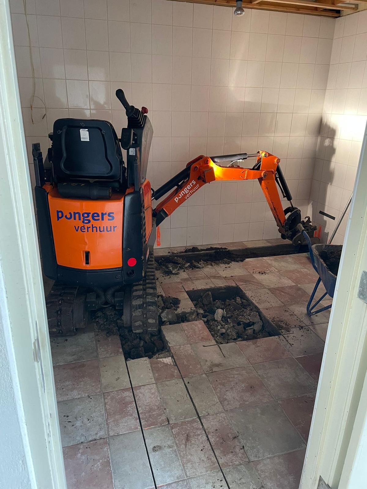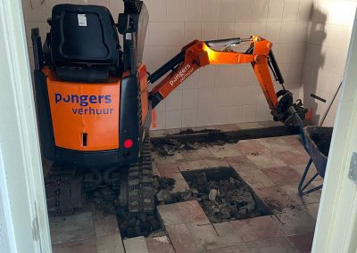 Na het inzagen van de betonvloer is deze uitgebroken met een minikraan voorzien van een sloophamer. Door de beperkte ruimte en de smalle doorgang is het werk zorgvuldig en stap voor stap uitgevoerd, zodat het beton gecontroleerd kon worden verwijderd.