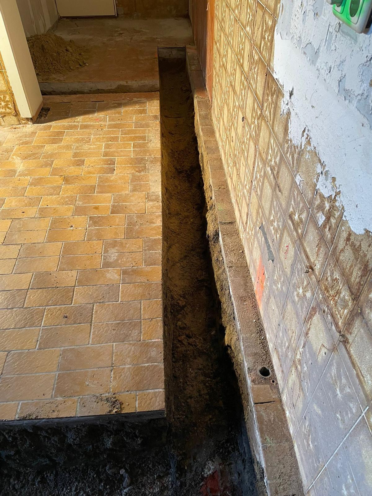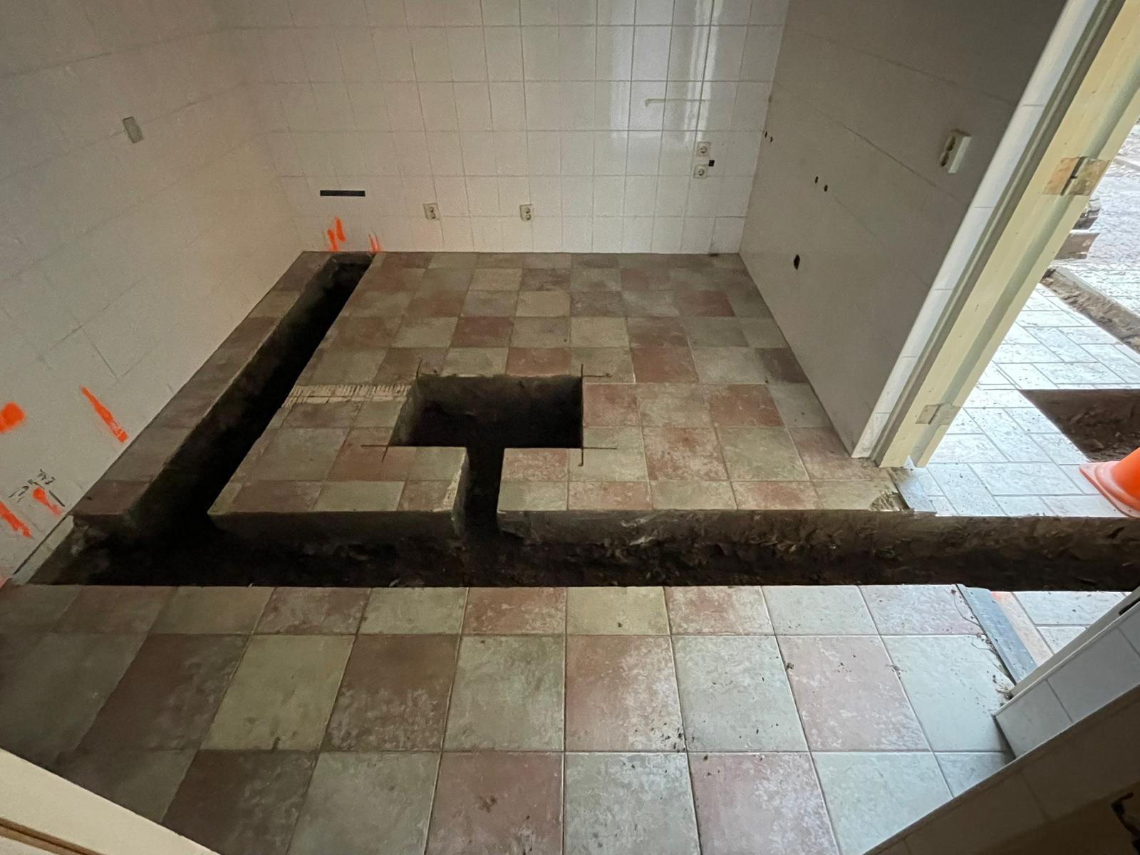 Voor de komst van de grootkeuken was het noodzakelijk om delen van de betonvloer te verwijderen. Door de vloer moesten nieuwe leidingen komen voor stroom, riolering en overige installaties. De beperkte ruimte en de smalle toegang maakten dit project extra uitdagend.